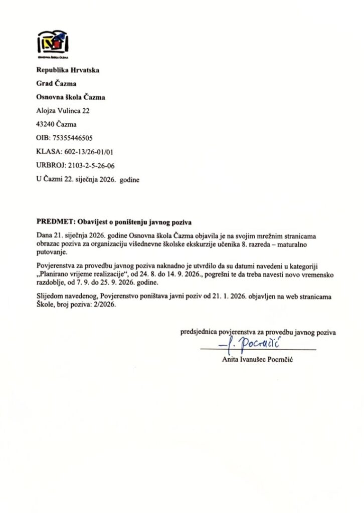 U prilogu se nalazi Odluka o poništavanju javnog poziva za organizaciju maturalca 2/2026.